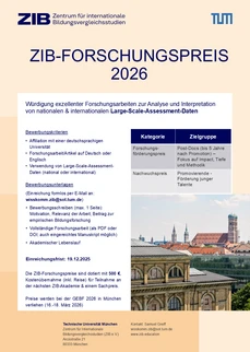 Das Zentrum für internationale Bildungsvergleichsstudien (ZIB e.V.) verleiht 2026 erstmals den ZIB-Forschungspreis zur Würdigung exzellenter wissenschaftlicher Arbeiten im Bereich der Analyse und Interpretation von Large-Scale-Assessment-Daten.